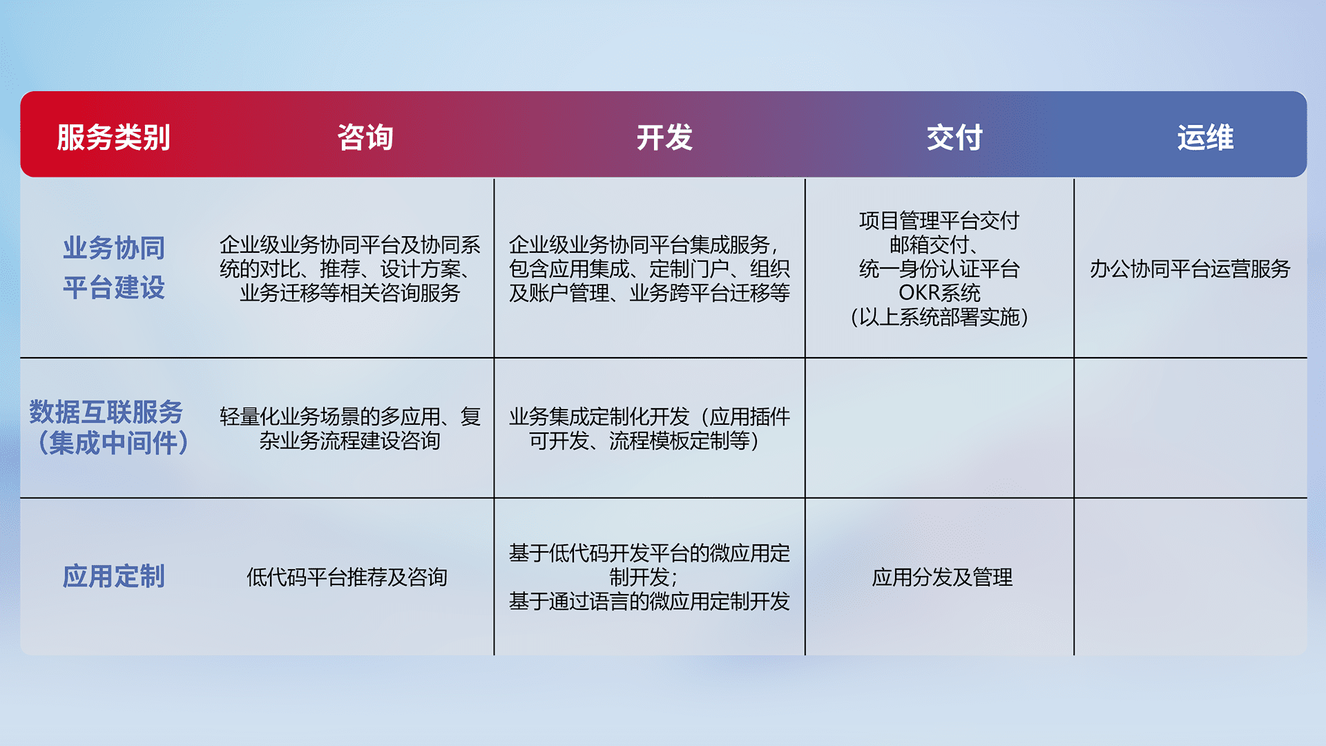 针对钉钉、、、企微、、、、IDaas等平台级产品提供产品的规划、、、方案、、交付、、、、定制化开发等服务,,实现如统一协同办公、、智能客户服务、、、混合会议管理、、、、智能数据查询、、、、等业务场景,,实现数字化转型。。。。